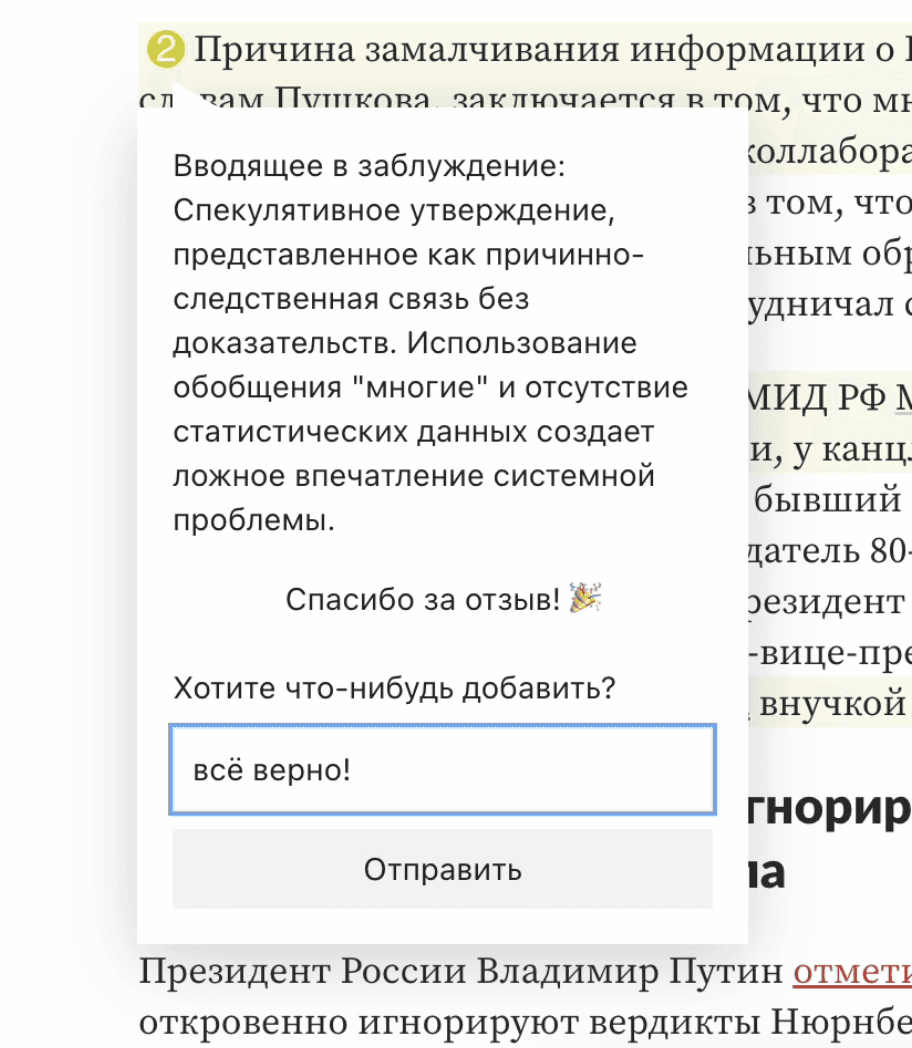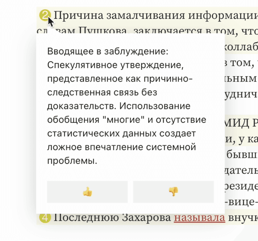 Искусственный интеллект анализирует текст и выделяет потенциально недостоверную информацию, помогая читателям сразу обратить внимание на спорные моменты.