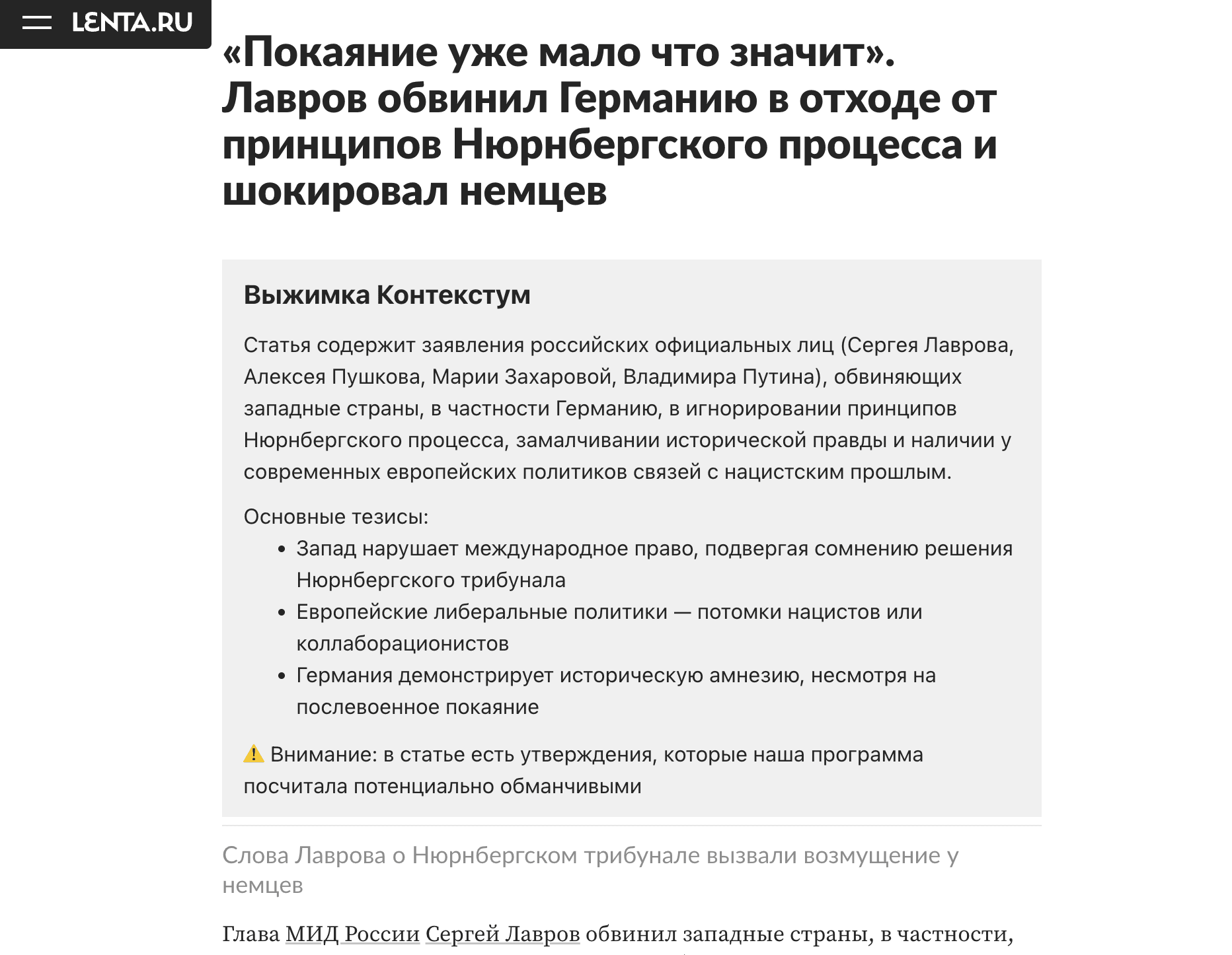 Никаких дополнительных действий не требуется — просто читайте новости как обычно, а Контекстум автоматически проанализирует достоверность информации.
